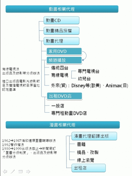 動畫代理-家用DVD | 市場中等,約96~00年,代理金相對不高(約500萬),進入容易;2002年以後,版權金提升,甚至要代理全亞洲代理權(有可能上億元,進入變難,但有資金者仍進入容易 |