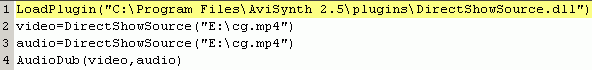 第一行是運用AviSynth的DirectShowSource的程式,表示可以用DirectShow的方式開啟電腦內擁有CODEC的影片。路徑請輸入AviSynth的目錄,此外,如果使用者有安裝上述建議的K-lite Mega CODEC的話,不一定需要寫這一行(寫了比較保險)